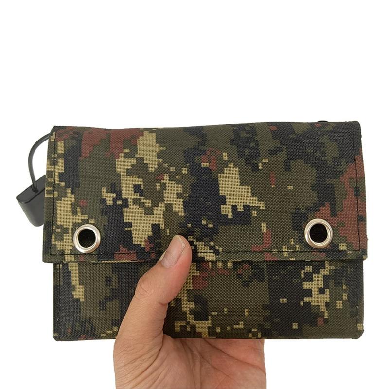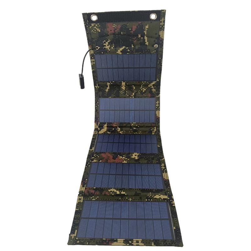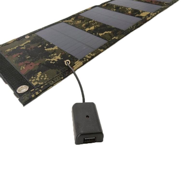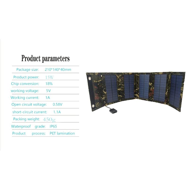 - 15W foldable solar charger with 5 panels for improved surface area and portability