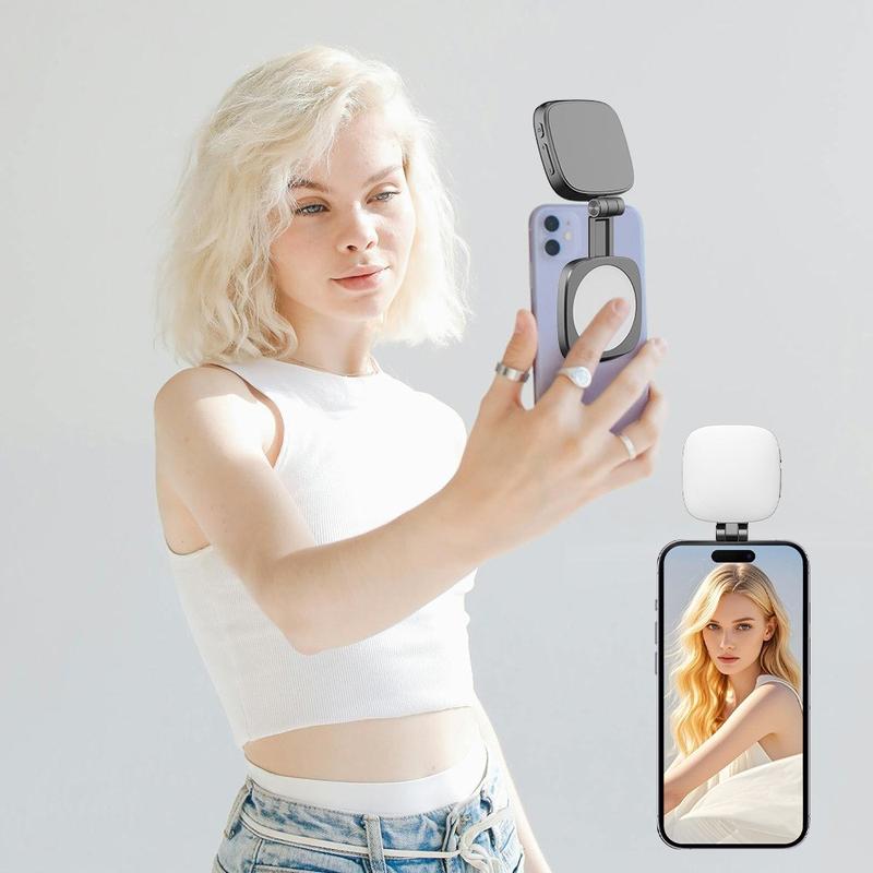 Achieve perfect lighting anytime with this 2-in-1 Magnetic LED Selfie Fill Light, designed for smartphones and on-the-go photography. The high-quality LED beads deliver soft, even illumination that enhances selfies, portraits and video calls in low-light environments. Thanks to its smart magnetic attachment, the lamp fixes securely to your device for hands-free use, while the integrated makeup mirror lets you make quick touch-ups before filming or shooting. With a built-in rechargeable battery and compact 149 g design, this portable lighting accessory is ideal for travel, vlogging, livestreaming and everyday mobile photography.