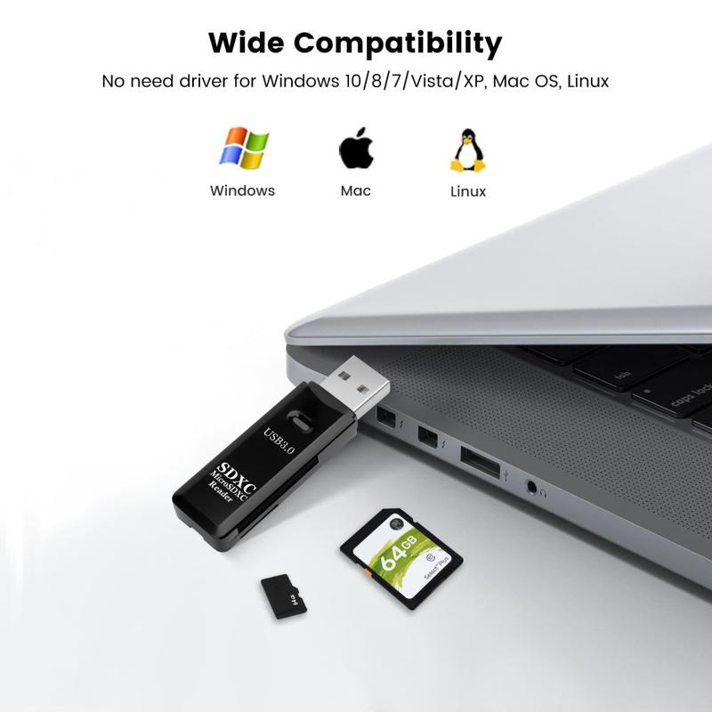 - Supports SD, SDXC, SDHC, MMC, TF, Micro SDHC, and Micro SDXC memory card formats.
