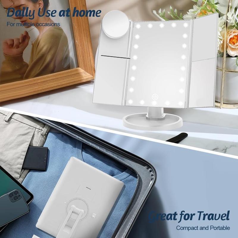The 3-Side foldable LED makeup mirror combines elegant design with practical features like adjustable brightness and multiple magnifications. Its compact foldable form makes it both a beautiful vanity accessory and a convenient travel companion.
