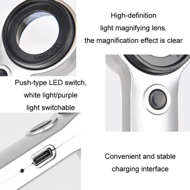 The 30x handheld rechargeable magnifying glass is designed for detailed inspection and clear magnification in everyday and professional tasks. Featuring a high-definition glass lens, it delivers sharp, distortion-free viewing for close-up work such as jewelry identification, reading fine print and examining small objects.