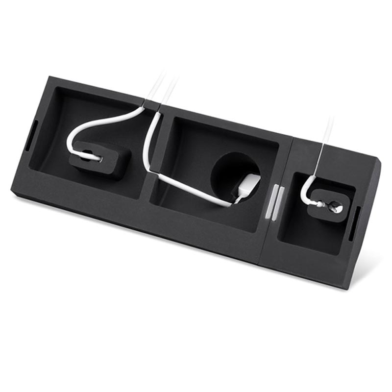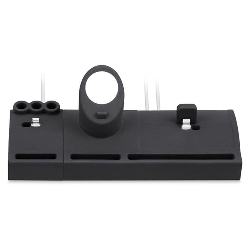This silicone charging stand works as a station for your Apple devices. It can hold your iPhone or iPod, AirPods, Apple Watch, and up to three Apple Pencils. Simply install your original Apple cables, and use it as a charging station for all your Apple devices. It even has a few slots for credit/ID cards, memory cards. You can detach the Apple pencil holder from the rest of the stand and use it separately.