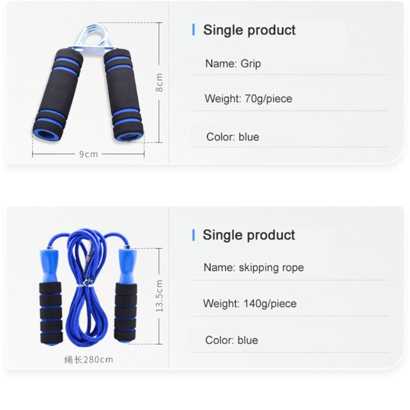 The set is suitable for a wide range of exercises, from core training and upper-body workouts to cardio and grip strengthening. The abdominal wheel helps target abdominal and back muscles, while the push-up bars support more stable and comfortable push-up sessions. The skipping rope adds a cardio element to your routine, and the hand gripper and chest expander allow focused strength work for the hands, forearms, chest, and arms.