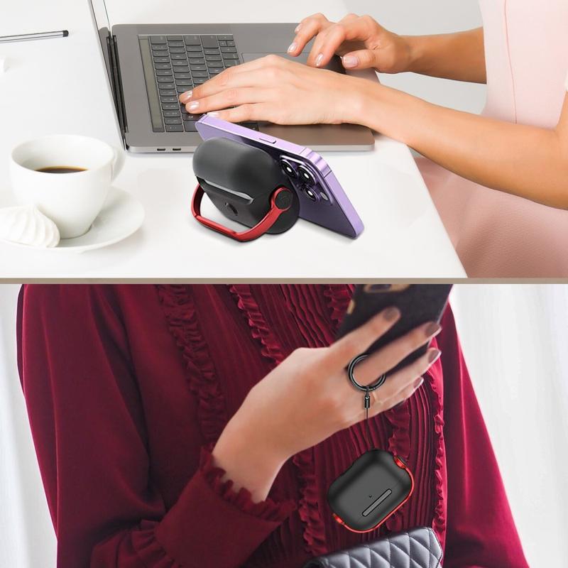The integrated metal ring functions both as a kickstand for hands-free viewing and as a carrying hook for attaching your AirPods to bags, keys, or belts.