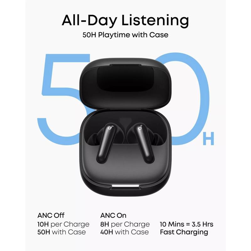 With up to 10 hours of playback on a single charge and up to 50 hours total with the charging case, the Soundcore R60i NC is built for extended everyday use. Fast charging support adds extra convenience, giving you up to 3 hours of listening from just a 10-minute charge. IP55 water and dust resistance on the earbuds also makes them a dependable option for workouts, outdoor use, and daily wear.