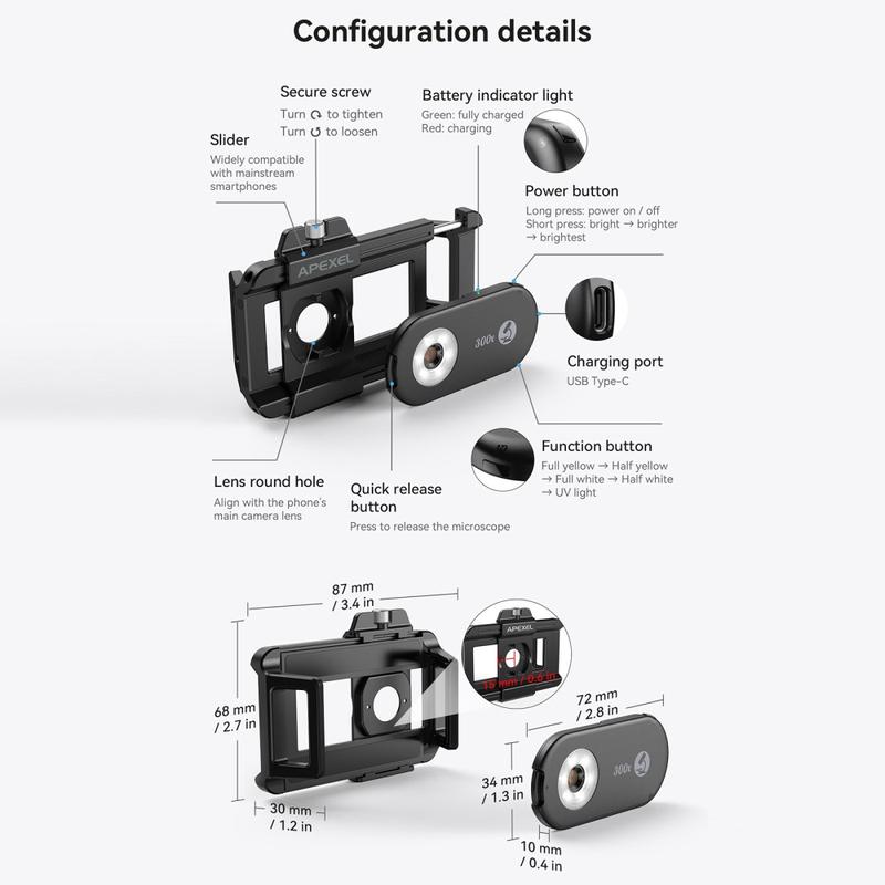 The APEXEL APL-MS300 Microscope Lens delivers professional-level magnification and lighting in a pocket-sized tool. Its precision optics, tri-color LED lighting, and UV detection make it an indispensable accessory for exploration, research, and creative photography.