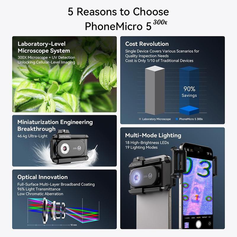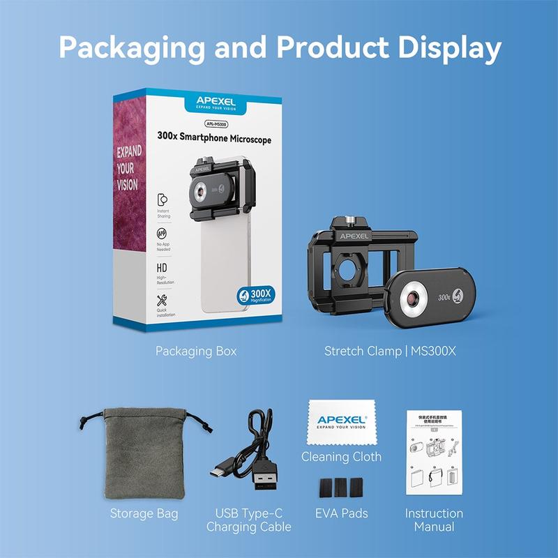Turn your smartphone into a powerful portable microscope with the APEXEL APL-MS300 300X clip-on microscope lens. Designed with professional-grade optics and advanced lighting systems, this compact attachment brings laboratory-level magnification right to your phone — perfect for science enthusiasts, educators, jewelers, and technicians.