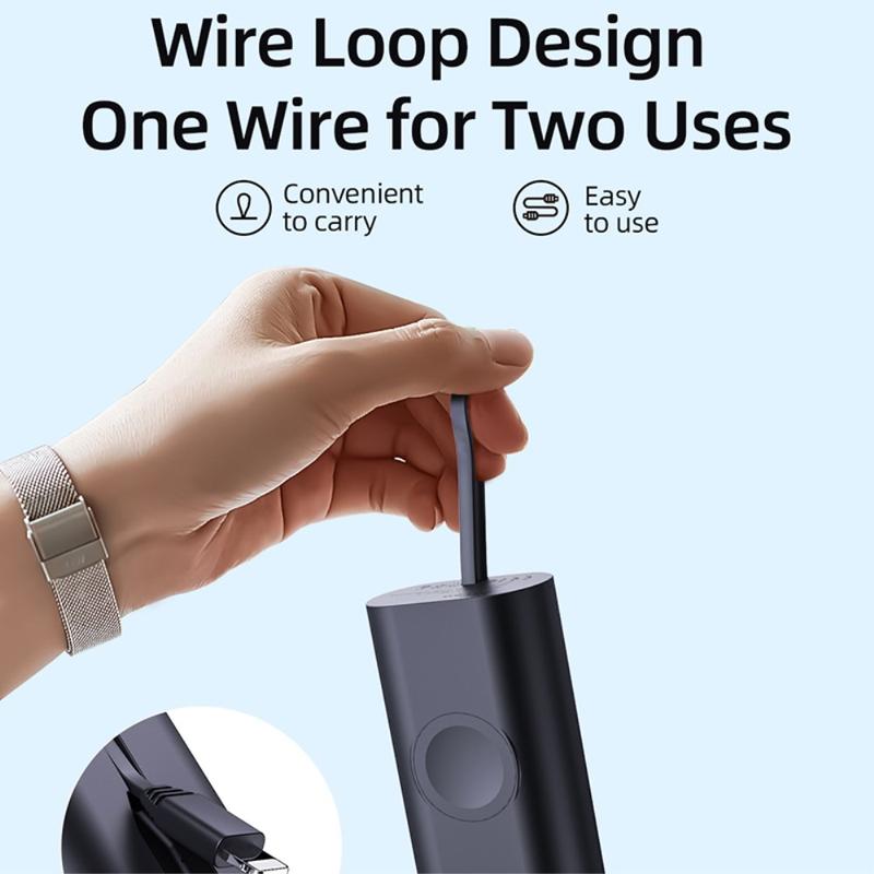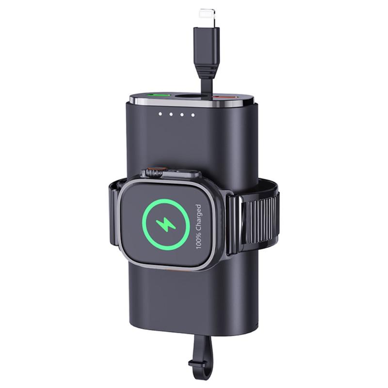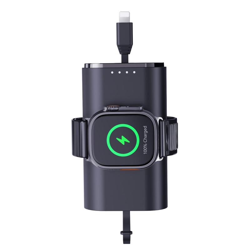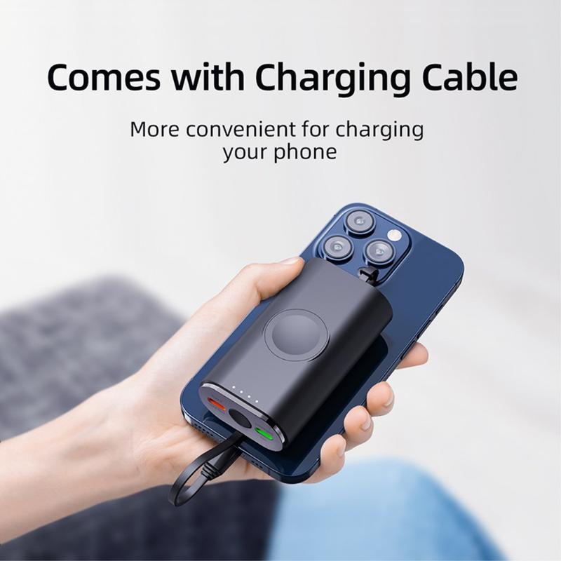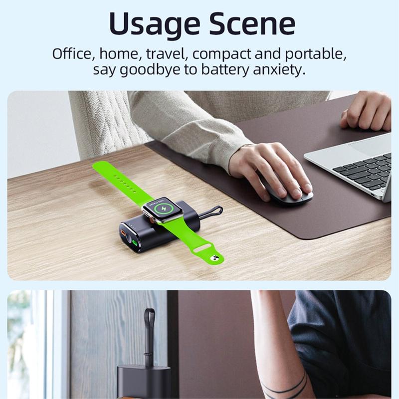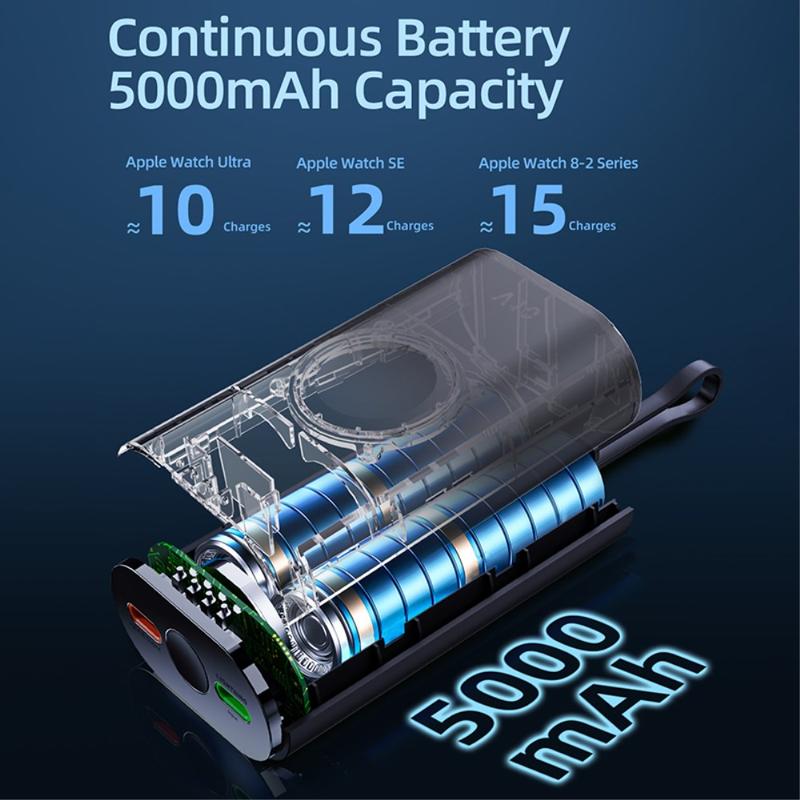 Its 5000mAh capacity makes it a useful backup power source for travel, commuting, workdays, and daily carry. The built-in magnetic charging area helps keep your Apple Watch aligned during charging, while the included cable and compact lightweight design make it easy to keep in a bag, pocket, or on a desk.