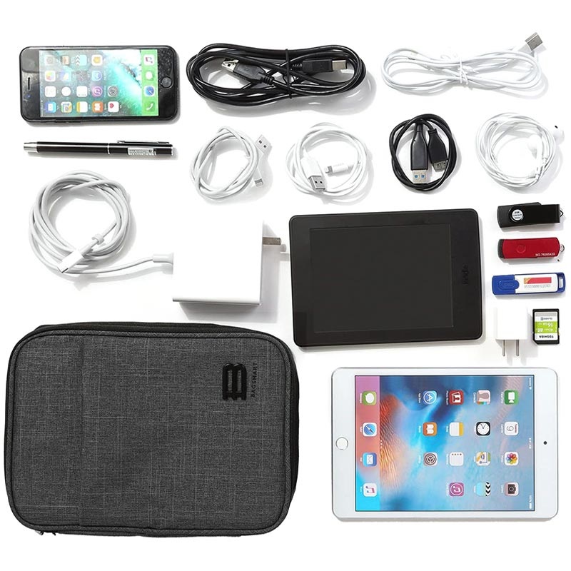 This Bagsmart Belmont organizer / carrying case is a perfect solution for family trips because it solves many problems such as tangling cables, etc. It features five elastic straps, five mesh pockets, an outer pocket, and a flexible hand strap. It is made of durable and water-resistant 300D polyester for additional security for your accessories.