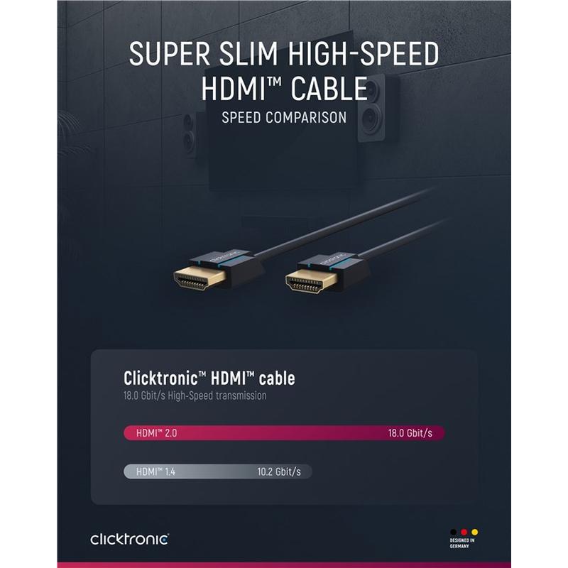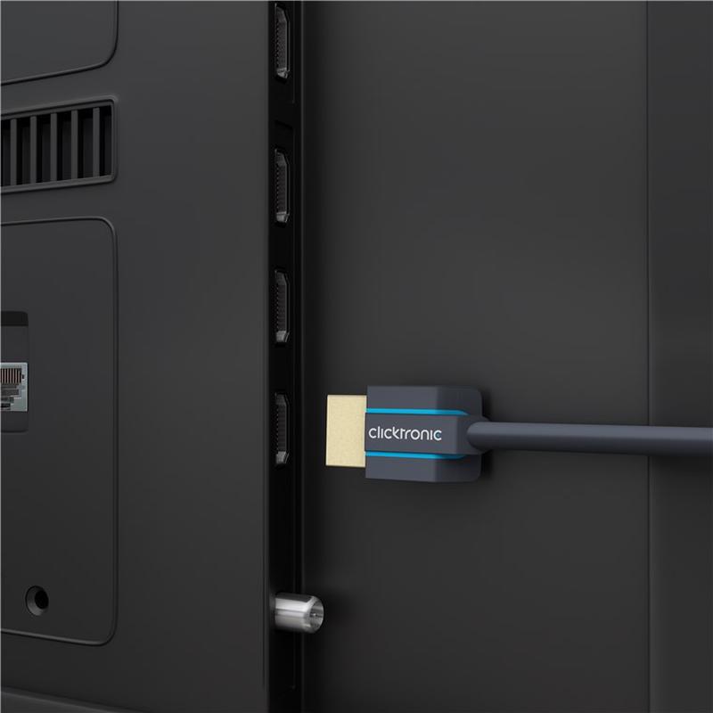 Den ultrasmala HDMI™-höghastighetskabeln ansluter TV-apparater och monitorer till t.ex. bärbara datorer, projektorer, beamers eller spelkonsoler som PlayStation eller Xbox för felfria film- och spelupplevelser. UHD-signalöverföring med upp till 4K @ 60 Hz (2160p) och Full HD @ 60 Hz (1080p), Extra smal HDMI™-anslutningskabel för hög flexibilitet vid anslutning och med maximal överföringshastighet på upp till 18 Gbit/s, 24 karat guldpläterade HDMI™-kontakter och avancerad teknik garanterar felfri signalkvalitet utan bildöverföringsfördröjningar för en optimal spelupplevelse. Rena kopparledare och 3-faldig avskärmning för klart ljud och knivskarp video- och bildkvalitet, Clicktronic 4K-kabel med HDMI™ Premium-certifiering garanterar bästa kvalitet. HDMI™-anslutning för alla vanliga funktioner som ARC (audio return channel), HDCP eller 3D-innehåll