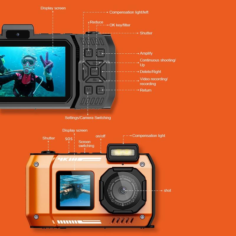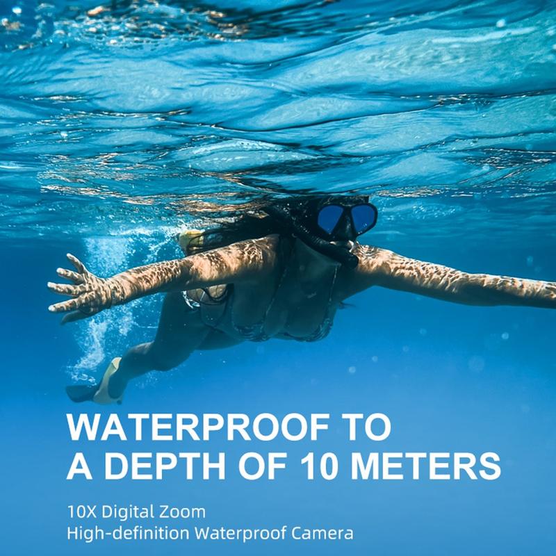 The D50 waterproof action camera is built for outdoor adventures, travel, and water sports, combining a dual-screen design with easy operation and long runtime. Use the front 1.44" IPS screen for selfies and vlogging, and the rear 2.88" IPS HD screen for framing, playback, and quick review. With IP68 waterproofing up to 10 m, it's ready for pool days, snorkelling, and rainy hikes. Creative shooters will love the 20 special filter effects, while electronic anti-shake helps keep footage smoother when you re moving. A built-in SOS one-click function adds extra peace of mind for outdoor activities. This set also includes a 32GB TF card and card reader, so you can start filming immediately.