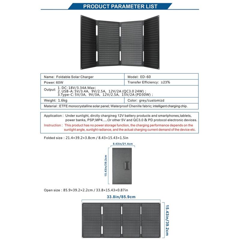 - 60W portable solar charger for outdoor and emergency use