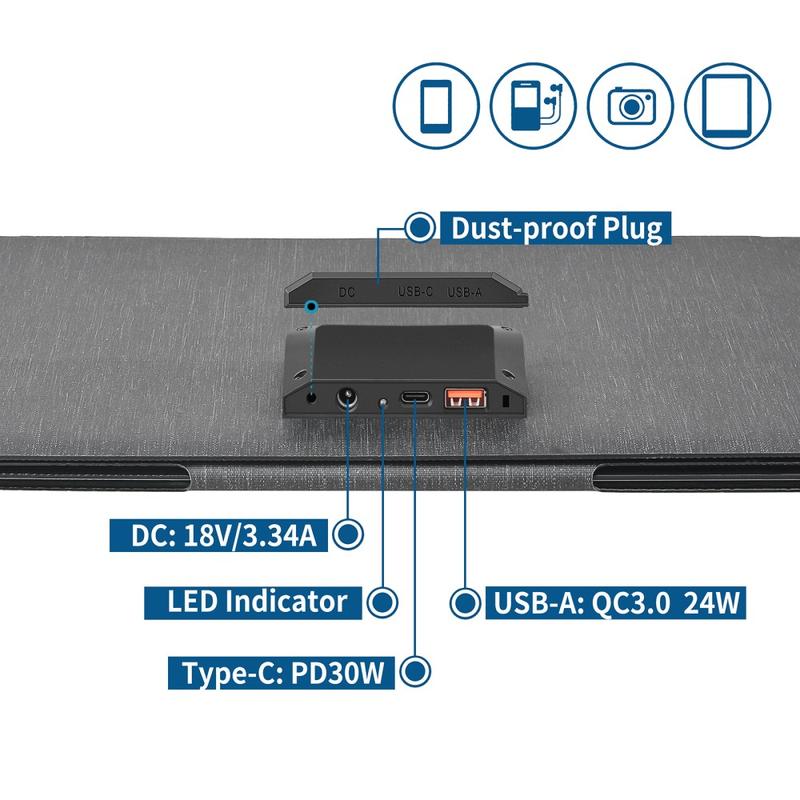With a compact foldable design, this solar charger is easy to carry in a backpack, store in a vehicle, or attach to outdoor gear during travel. Despite its portable size, it offers up to 60W power output and multiple charging options, including DC, USB-A, and USB-C, making it suitable for charging phones, tablets, power banks, smaller laptops, cameras, and other compatible devices.