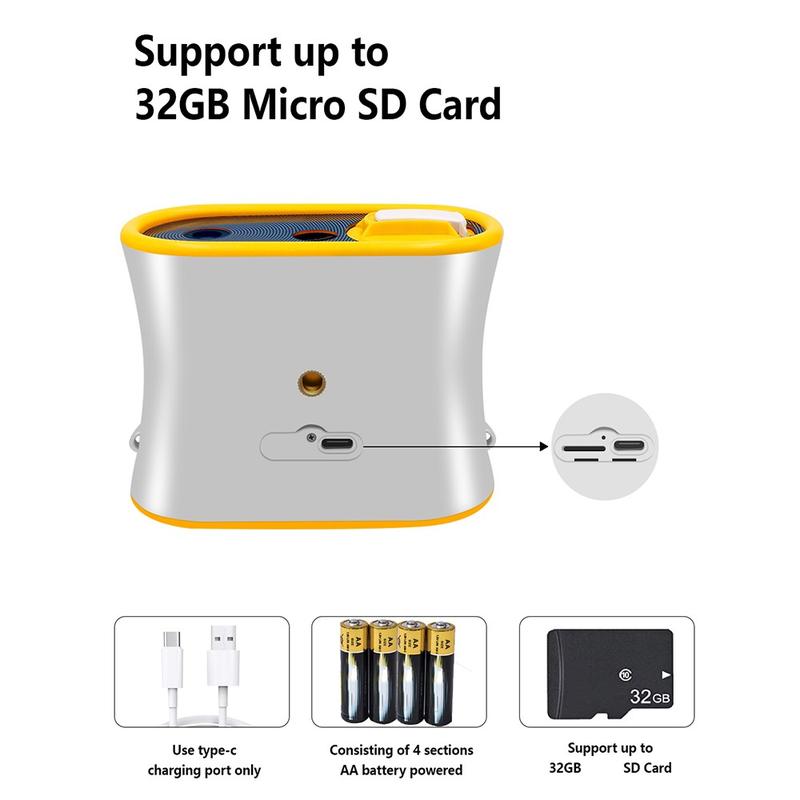 The DT15 is powered by 4 × AA batteries or Type-C charging, making it convenient for travel and outdoor use. With its lightweight design and included lanyard, kids can carry it safely and comfortably. Storage is expandable with a 32 GB microSD card (not included).