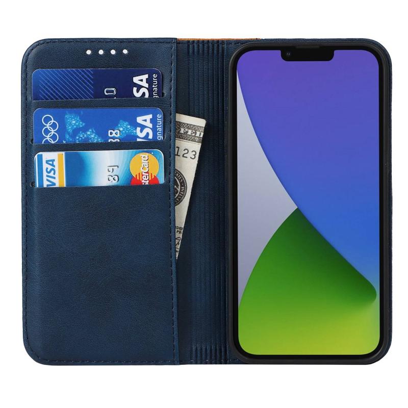 For iPhone 14 Bi-color Splicing Magnetic Auto-absorbed Calf Texture PU Leather Phone Case Drop-proof Wallet Stand Cover