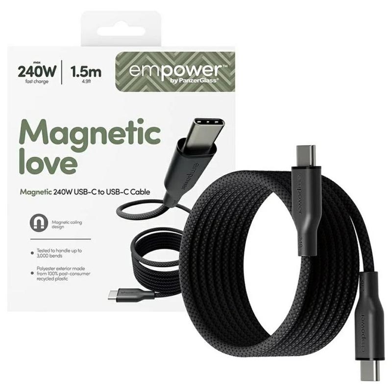 The empower by PanzerGlass Magnetic USB-C to USB-C Cable combines ultra-fast charging with smart, tidy storage. Designed for high-power USB-C devices, it supports up to 240W power delivery while the integrated magnetic attachment keeps the cable neatly organised when not in use. Durable, flexible, and made from recycled materials, it’s built for everyday convenience and long-term reliability.