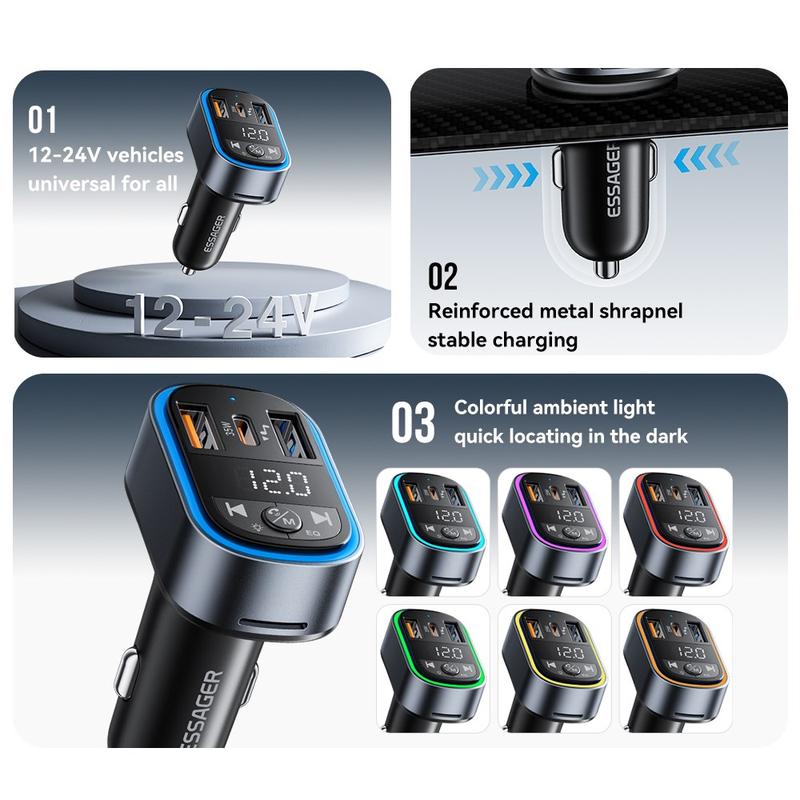 The ESSAGER ECCFM-CT0G-P combines fast charging, Bluetooth 5.3 wireless streaming, an FM transmitter, HD hands-free calling and media playback support—all in one compact, stylish car accessory. A perfect upgrade for safer driving and enhanced in-car entertainment.