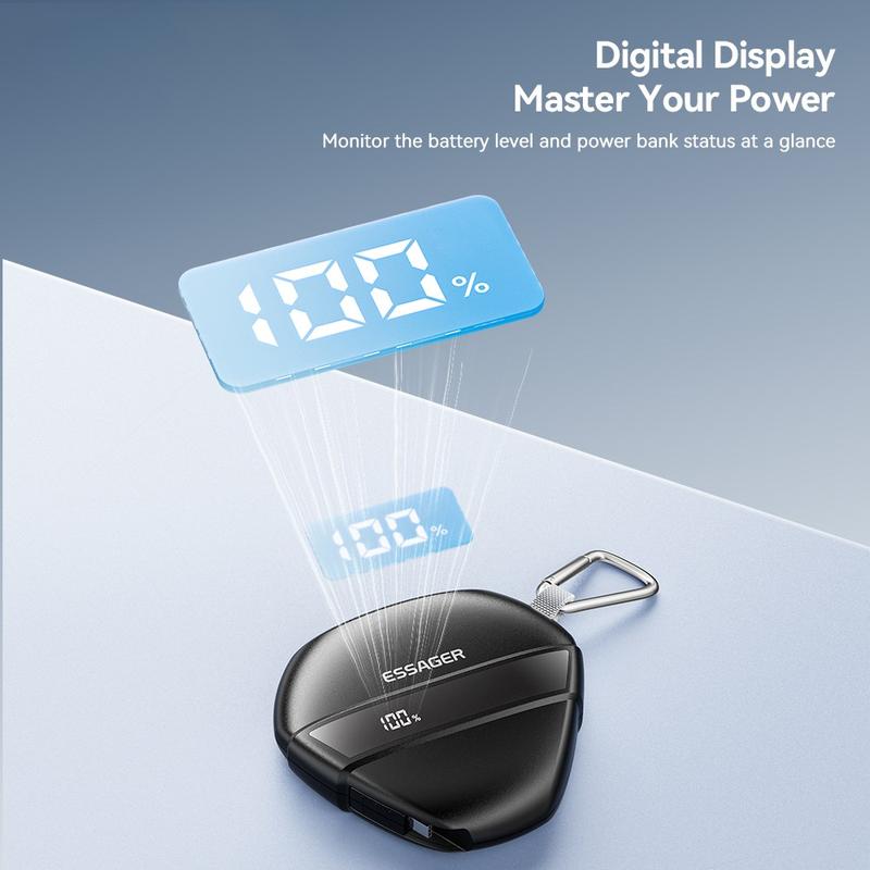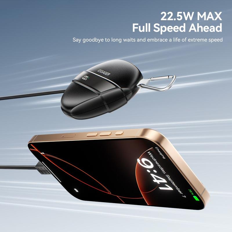 The ESSAGER 22.5W fast charging power bank offers high-speed charging, built-in cable convenience, durable construction, and travel-friendly design—making it a great companion for daily use, commuting, and outdoor activities.