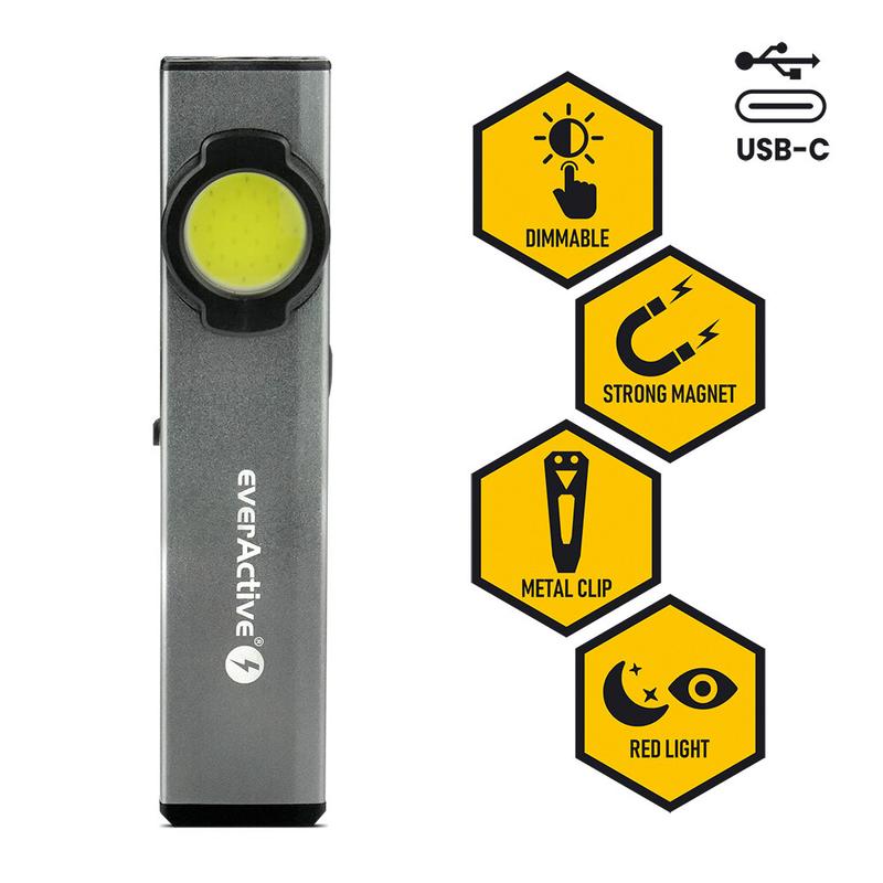 EverActive WL-250R Rechargeable LED Workshop Flashlight - 300 Lumens, 4 Modes, Magnetic Base & Clip