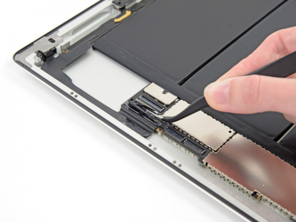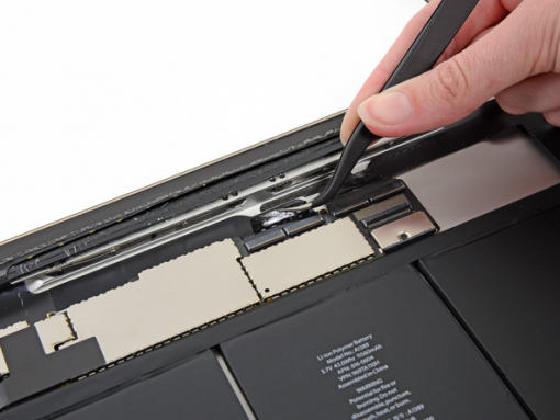 A piece of tape is securing the digitizer ribbon cable to the logic board. Peel it back with a pair of tweezers.