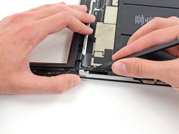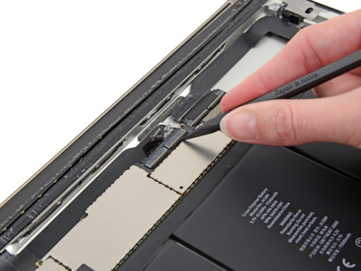 Peel back the digitizer ribbon cable. Separate the cable from the adhesive securing it to the rear aluminum case with the flat end of a spudger.