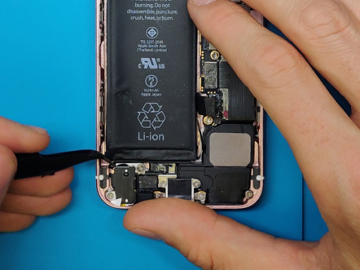 Use the tweezers or the tip of the spudger to unfold the battery adhesive tabs between the battery itself and the headphone jack assembly.