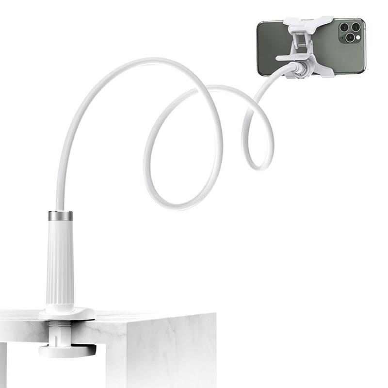 - Flexible gooseneck phone holder for table, desk, shelf, or bed use