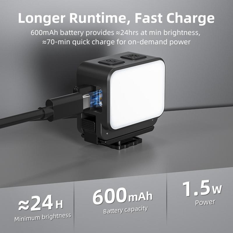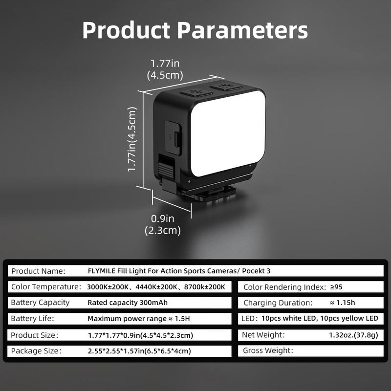 Upgrade your videos and photos with the FLYMILE action camera fill light, designed to bring clean, flattering illumination to vlogs, night shots, and close-up scenes. The compact light snaps into place fast thanks to strong built-in magnets, and its IPX4 splash-proof housing makes it a reliable companion for outdoor filming. With three colour temperature options and multiple lighting modes, you can quickly match the environment and keep your footage looking sharp, natural, and professional.