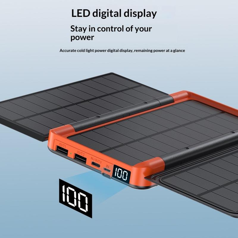 The foldable monocrystalline solar panels open with a single press, helping you take advantage of sunlight during outdoor activities. In addition to solar charging support, the power bank offers multiple wired input and output options, making it easy to charge a wide range of devices. The LED digital display lets you check battery status more clearly, while the rugged construction is designed for more demanding everyday use outdoors.