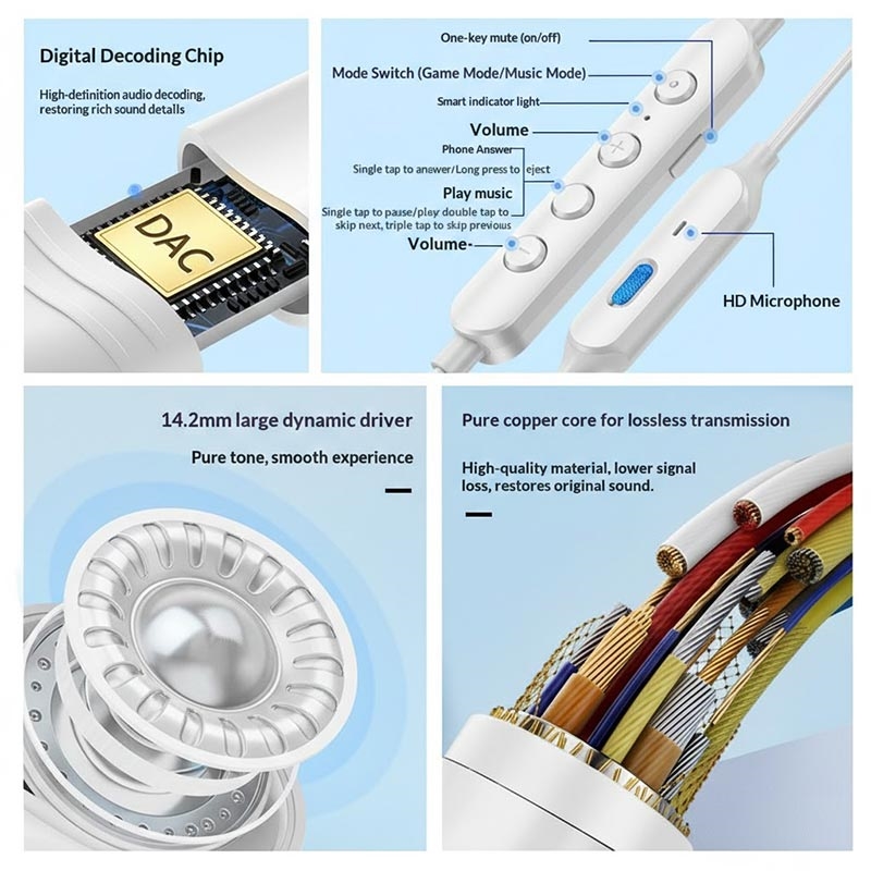 The GC0098 Type-C Wired Earphones are designed for immersive gaming and everyday music listening, combining powerful sound performance with practical features for daily use. Equipped with a large 14.2 mm dynamic driver and a built-in digital decoding chip, they deliver clear Hi-Fi stereo sound with deep bass and detailed highs. With dual gaming and music modes, a stable Type-C connection, and a magnetic design to prevent tangling, these earphones are a reliable choice for smartphones, tablets, and other Type-C devices.