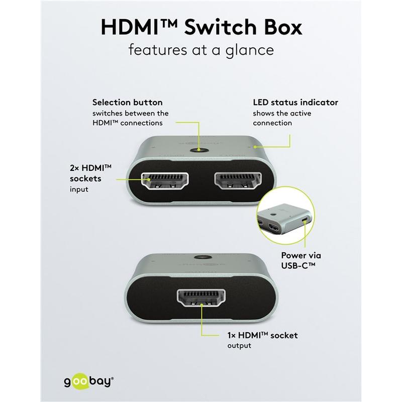 The Goobay HDMI Switch 2 to 1 lets you connect 2 HDMI devices to 1 TV, monitor, or projector and switch between them with ease. Supporting up to 8K@60Hz, 3D, HDCP, and USB-C power, it is a practical HDMI selector for consoles, laptops, Blu-ray players, and modern home entertainment setups.