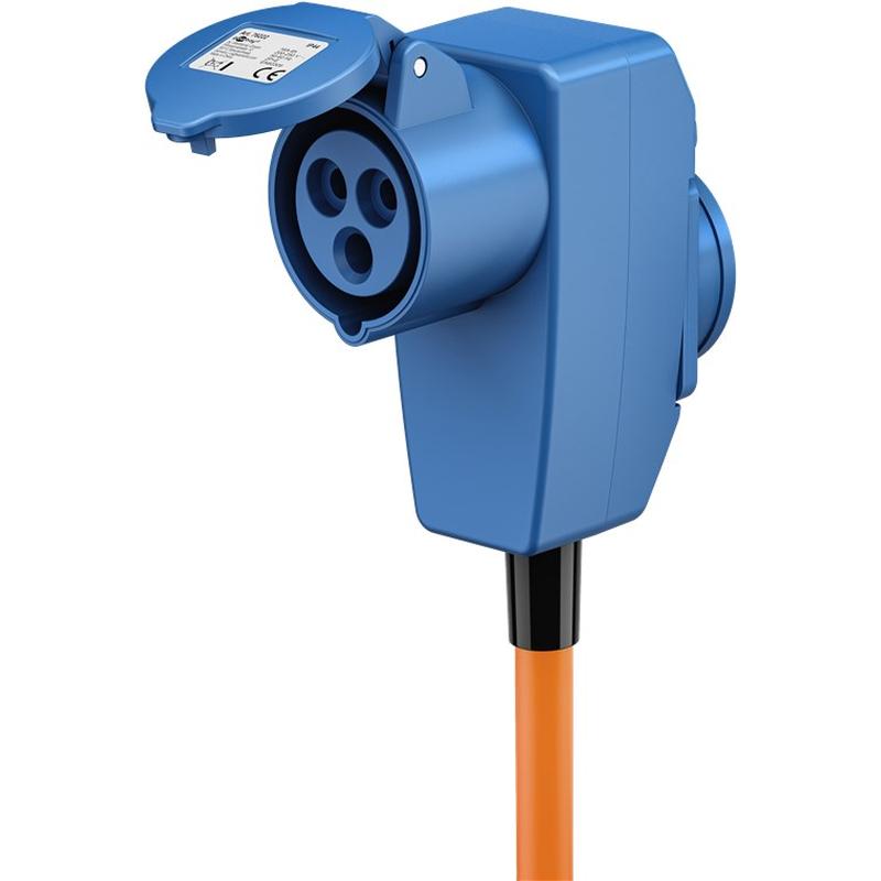 With its angled CEE coupler, this adapter cable is especially practical where space is limited, such as behind equipment, inside power boxes or at campsites.