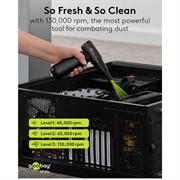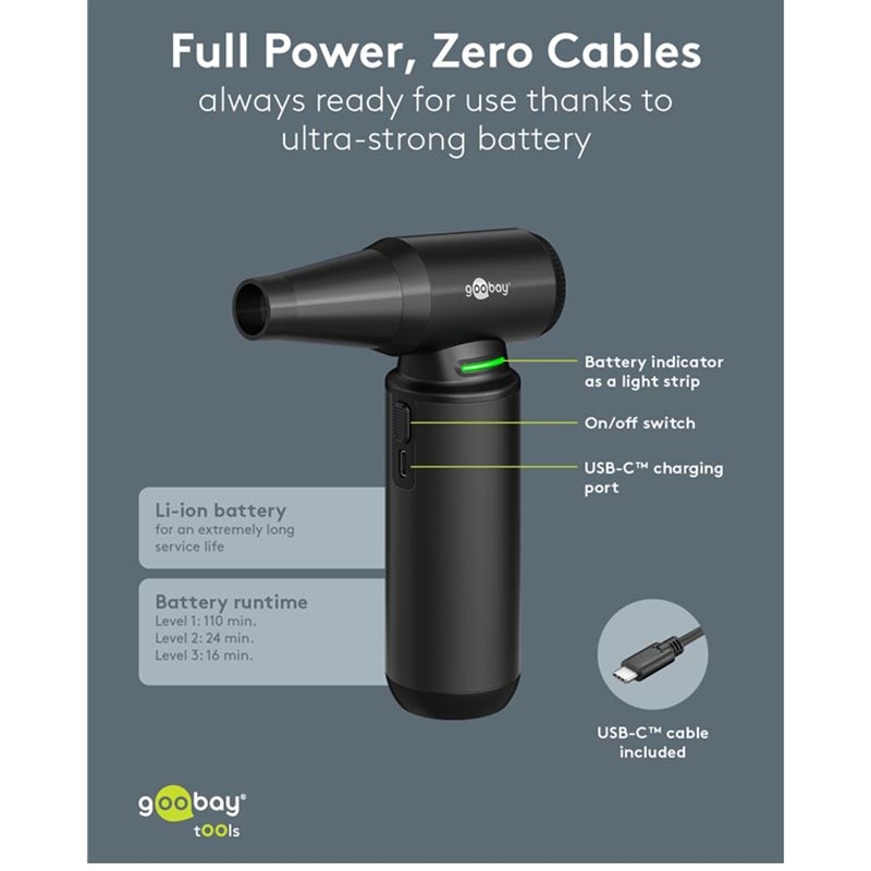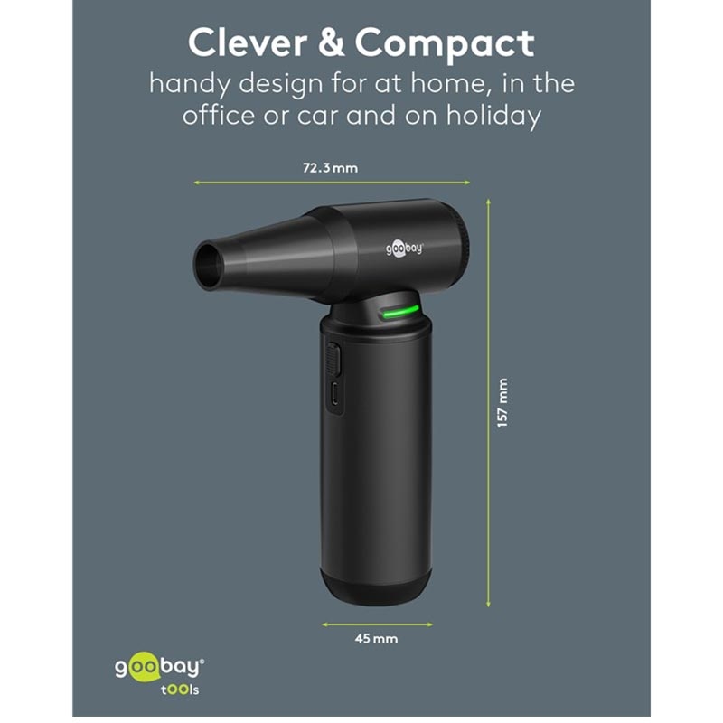 The Goobay Air Duster Superior is the ultimate alternative to compressed air cans. With a staggering 130,000 rpm brushless motor and 180 W power, it delivers unmatched blowing force for removing dust, pet hair and debris from keyboards, PC cases, car interiors, workbenches and more. Rechargeable, cordless and sustainably designed, this air duster offers top performance at home, in the office or on the go.