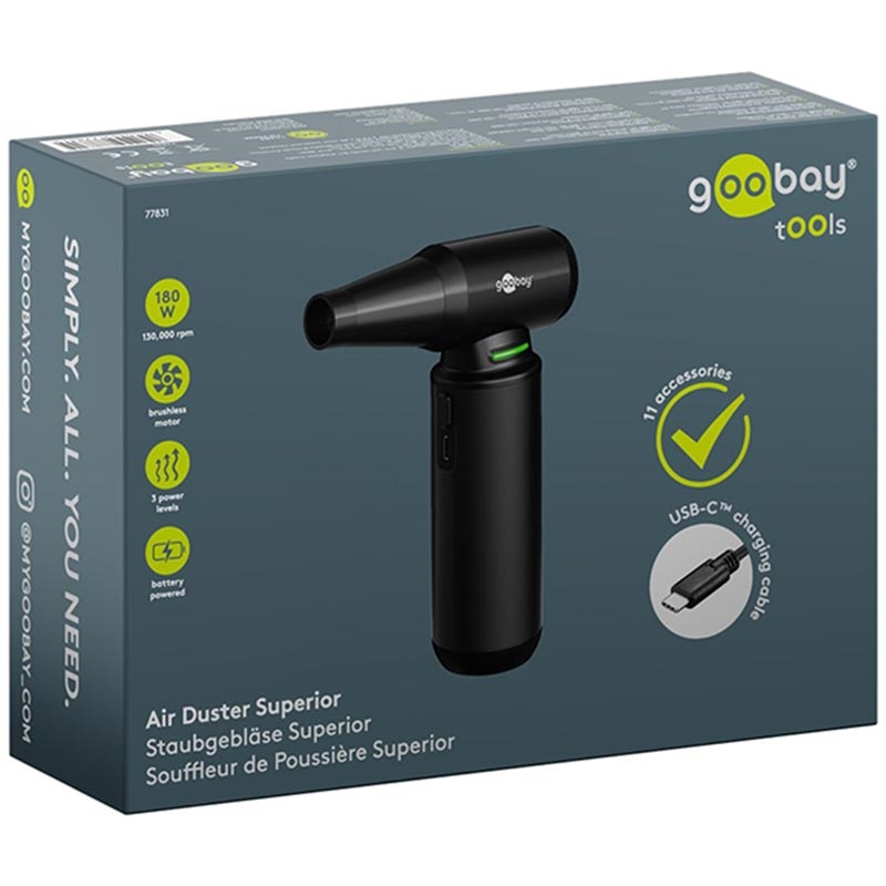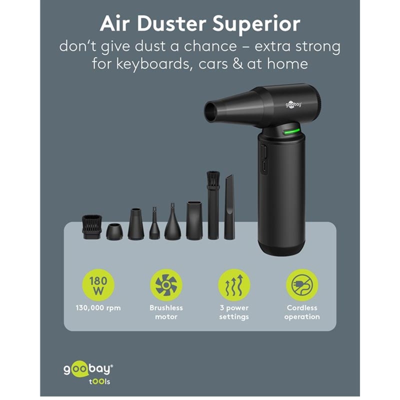 Goobay Air Duster Superior - 130000rpm Cordless Electric Air Blower with 8 Nozzles & 3 Brushes (180 W, Aluminium Design)