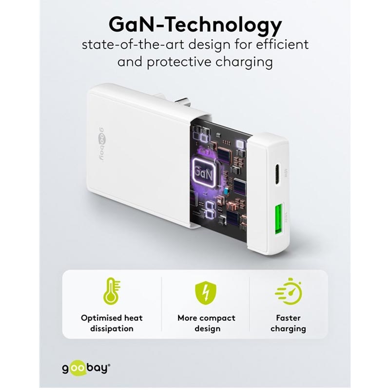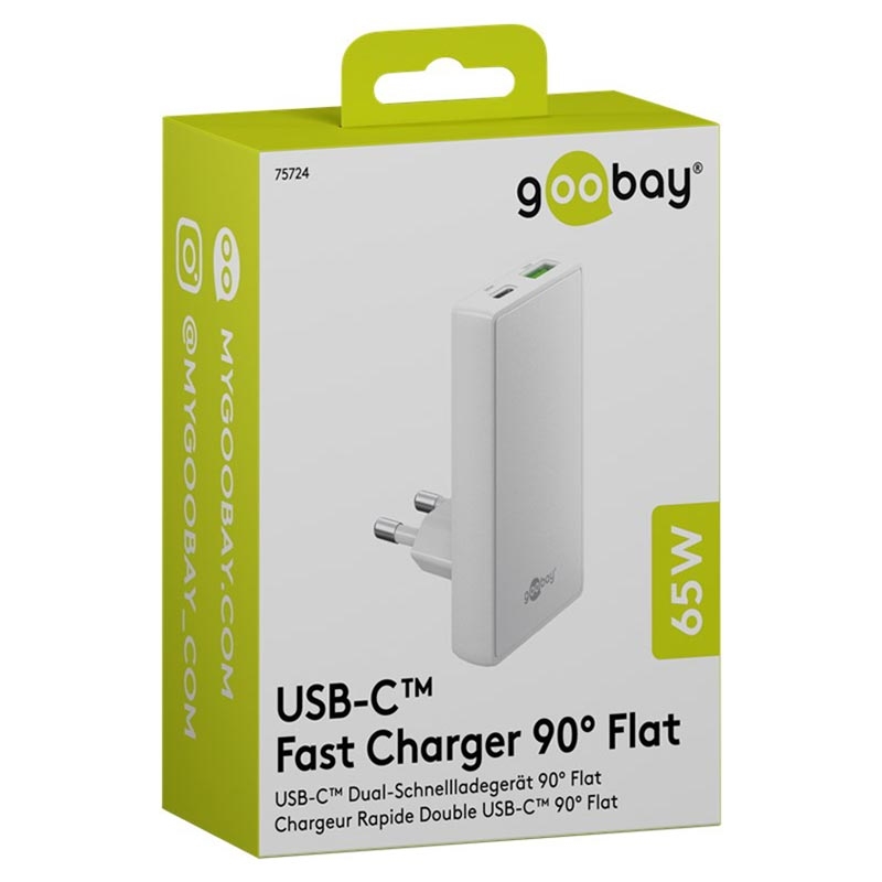 Goobay GaN Dual Fast Charger 90° Flat 65W - Ultra-Slim Wall Charger with USB-C & USB-A Ports