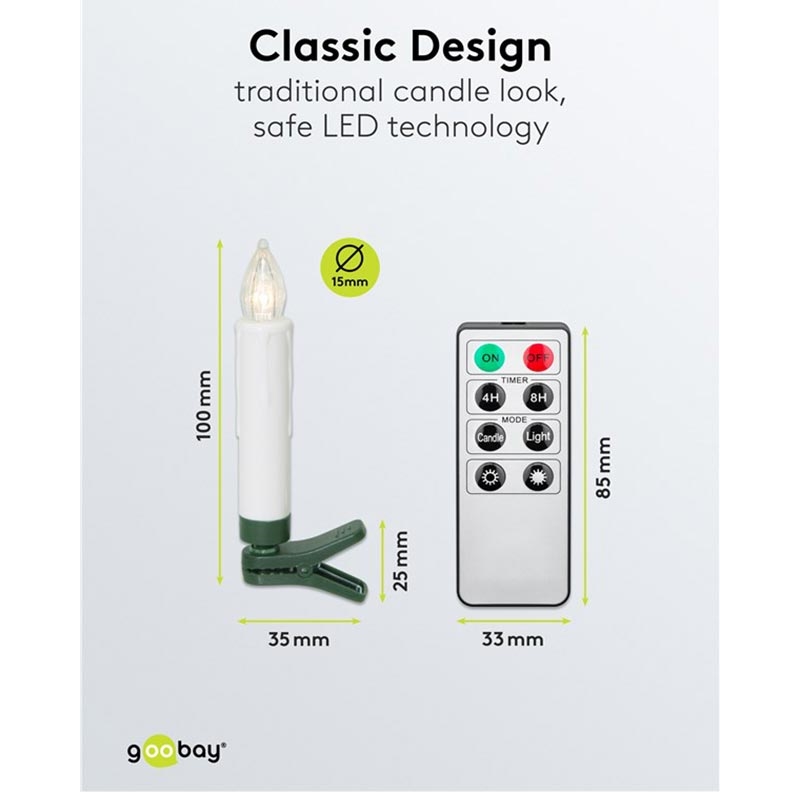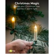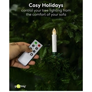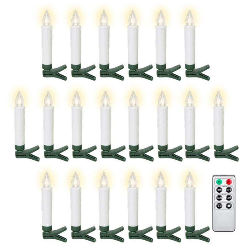 Capture the beauty of classic Christmas candlelight—without smoke, flames or dripping wax. This set of 20 wireless LED Christmas tree candles produces a warm white 2600 K glow with a realistic wax-style finish. The cordless design keeps your tree neat and elegant, while the included clips allow precise candle placement. With the remote control, you can adjust brightness, choose between flame modes, and activate timer settings for effortless festive lighting. A perfect combination of traditional charm and modern convenience, offering safe, long-lasting ambience throughout the holiday season.