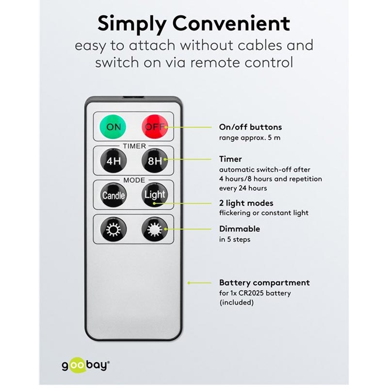 - Batteries: Candle - 1× AAA (not included), Remote - 1× CR2025 (included)