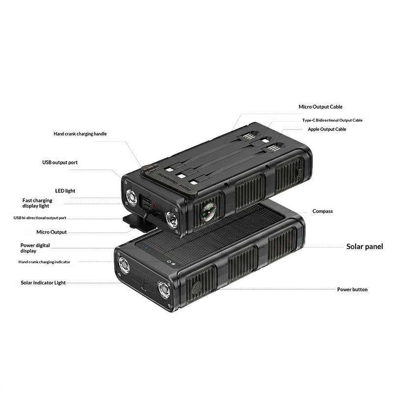 Outdoor power banks are popular because they combine portable charging with extra survival-style features in one device. Models with solar and hand crank support are especially useful for emergency kits, since they offer additional backup options when wall charging is not available. Built-in cables also make them more practical for travel by reducing the need to pack multiple separate cords.