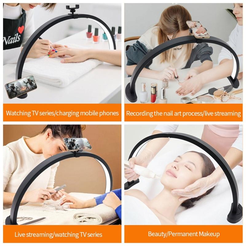 Create clean, flattering light for precision work with the HD-M11X 28-inch U-shaped shadowless LED fill light. Its semi-circular design helps reduce harsh shadows, making it ideal for beauty treatments, nail art, tattoo work, content creation, and detailed desk tasks. With 280 dual-colour LEDs, you can switch between warm and cool tones and fine-tune the mood from 3200K to 5600K. A high CRI >90 helps colours look natural and accurate—especially useful when matching makeup tones, choosing nail colours, or working with skin tones. The lamp delivers up to 2500 lm brightness at 40W, and includes desktop brackets plus a phone holder accessory set for a tidy workstation setup.