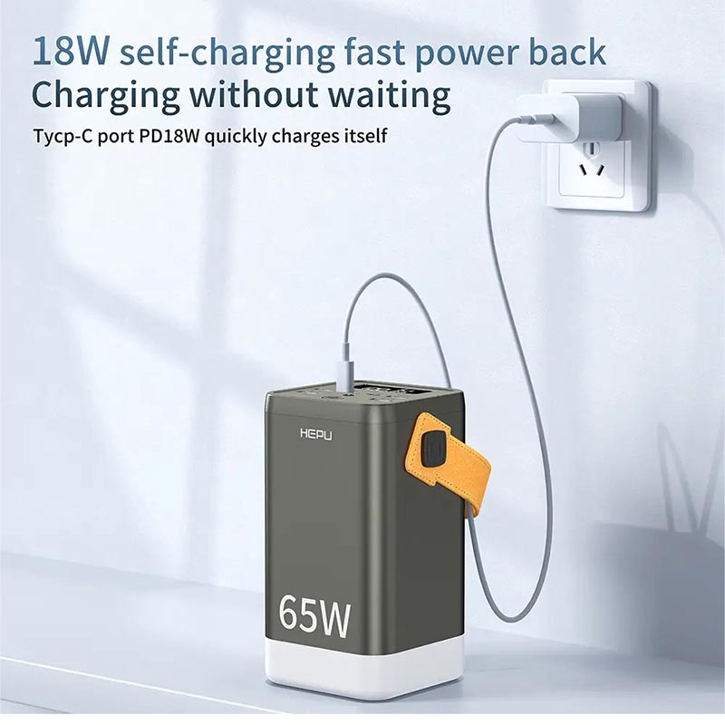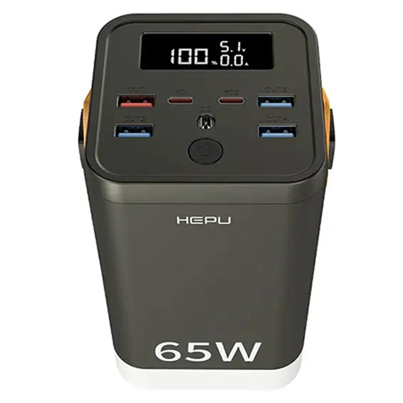 The HEPU XXL HP211 is a massive 60000mAh power bank designed for users who need multiple charging ports and long-lasting capacity. With four USB-A ports, two USB-C PD ports, and one DC port, it can power several devices at once, including smartphones, tablets, and smaller laptops. While it promises 65W fast charging support on paper, its performance is best suited for users who prioritize capacity over speed.