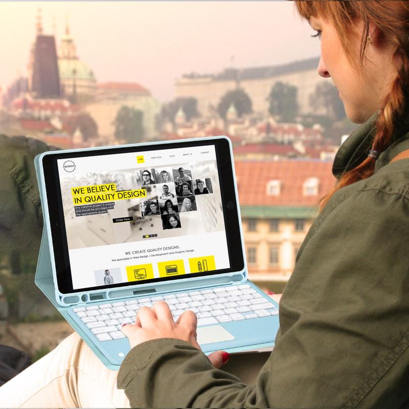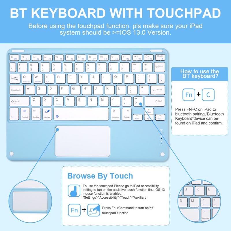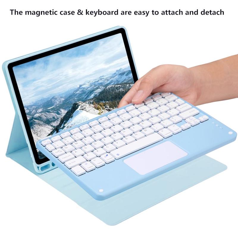 Enhance your iPad Air 11 2026/2025/2024, iPad Air 2022/2020 with the Bluetooth keyboard case, a multifunctional 2-in-1 accessory that combines protection, productivity, and style. Crafted from premium polyrethane, this sleek case provides full protection against scratches, shocks, and fingerprints while maintaining a professional look. The Bluetooth keyboard connects wirelessly for smooth, responsive typing, while the integrated touchpad supports multi-gesture control for effortless navigation. Featuring a backlit keyboard, you can type comfortably even in low-light environments. The built-in adjustable stand offers an ergonomic viewing angle, making it perfect for typing, streaming, or reading. Designed for business, travel, or everyday use, this keyboard case transforms your tablet into a portable workstation.