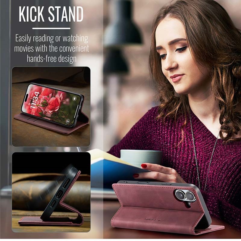 A combination of TPU and polyurethane provides all-around protection for iPhone 16 Plus, shielding it from dust, dirt, impacts, scratches, and daily wear. Magnetic attraction keeps the case closed, and clever design enables hands-free usage while watching media content.