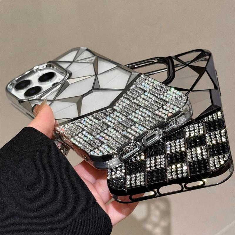 iPhone 16 Pro Max Geometric Diamond Pattern Case - Electroplated TPU Cover with Rhinestone Decor & Shock Protection
