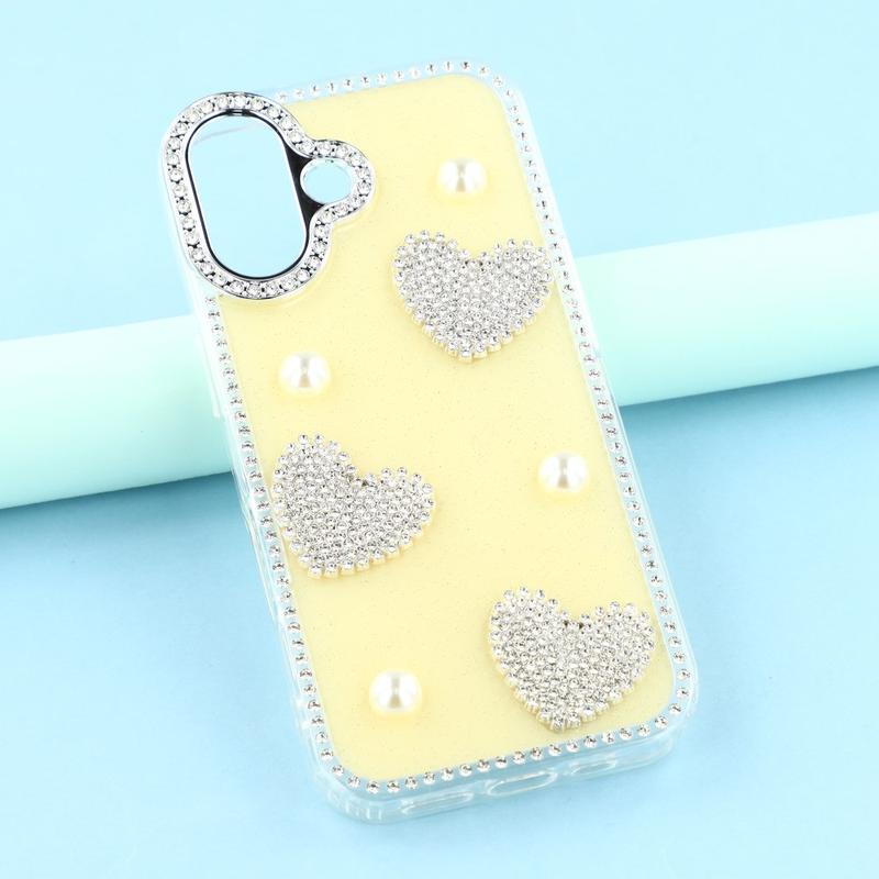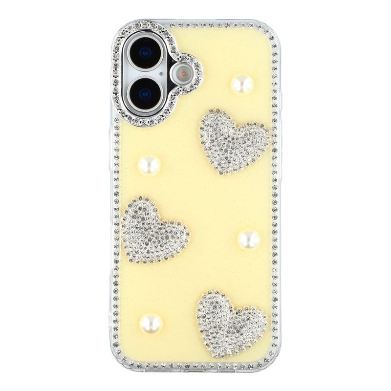 This iPhone 16 case combines reliable everyday protection with glamorous style. Featuring shimmering rhinestones around the edges and sparkling pearl heart decorations on the back, it turns your iPhone 16 into a fashionable accessory while keeping it safe from scratches and bumps.