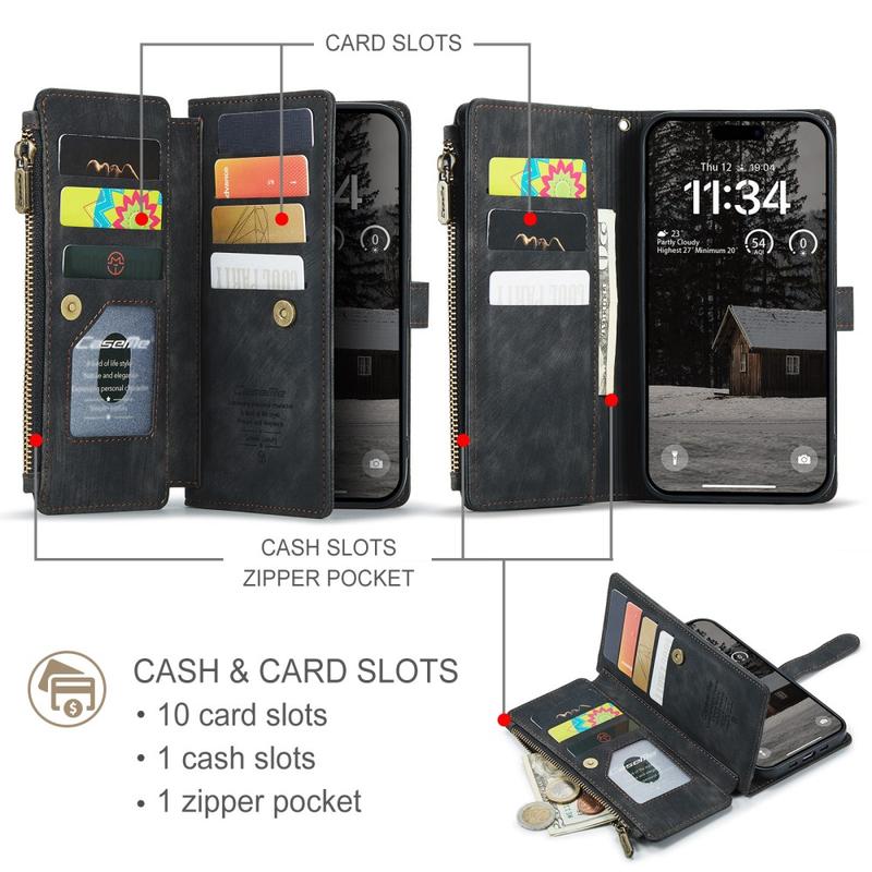 The Caseme C30 multifunctional wallet case for iPhone Air brings exceptional all-around protection and an exclusive, refined design. This elegant case is made of premium polyurethane, reinforced with a shock-resistant TPU inner cover that snuggles your iPhone Air perfectly. Meanwhile, the Caseme C30 wallet case is enhanced with numerous card slots, one large money compartment inside, and one outside zipper pocket, all protected by a secure magnetic closure.