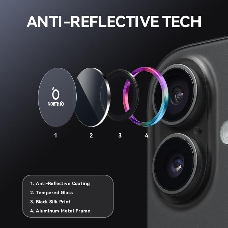 Upgrade your iPhone 17 with the Northjo camera lens protector. Featuring a CD veins aluminum ring, it adds a sleek, modern touch to your iPhone 17 while offering robust protection. The 9H tempered glass safeguards against scratches, impacts, and dust, ensuring your camera lens stays crystal clear. With easy, tool-free installation, you can enhance your iPhone 17 durability and aesthetics in seconds.