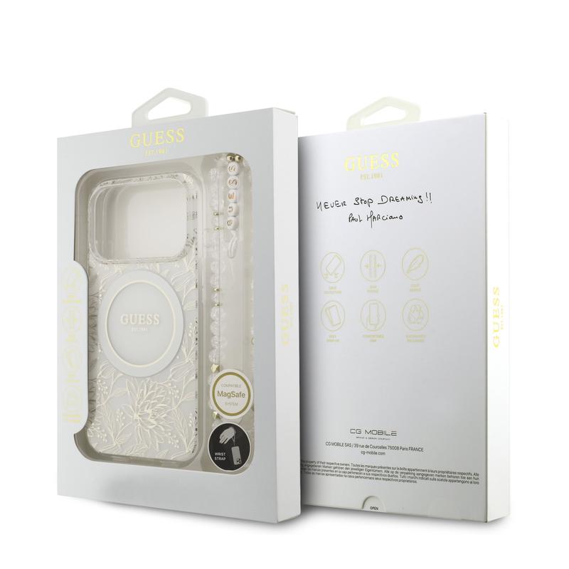 Guess IML Flowers Allover Electro Case with Pearl Strap for iPhone 17 Pro - MagSafe Compatible
