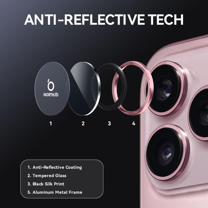 Upgrade your iPhone 17 Pro, iPhone 17 Pro Max with the Northjo camera lens protector. Featuring a CD veins aluminum ring, it adds a sleek, modern touch to your iPhone 17 Pro, iPhone 17 Pro Max while offering robust protection. The 9H tempered glass safeguards against scratches, impacts, and dust, ensuring your camera lens stays crystal clear. With easy, tool-free installation, you can enhance your iPhone 17 Pro, iPhone 17 Pro Max durability and aesthetics in seconds.