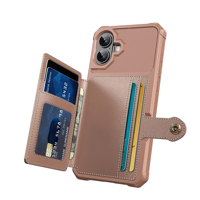 - iPhone 17 wallet case has a secure snap button closure, wallet design, and several card slots with cash pocket