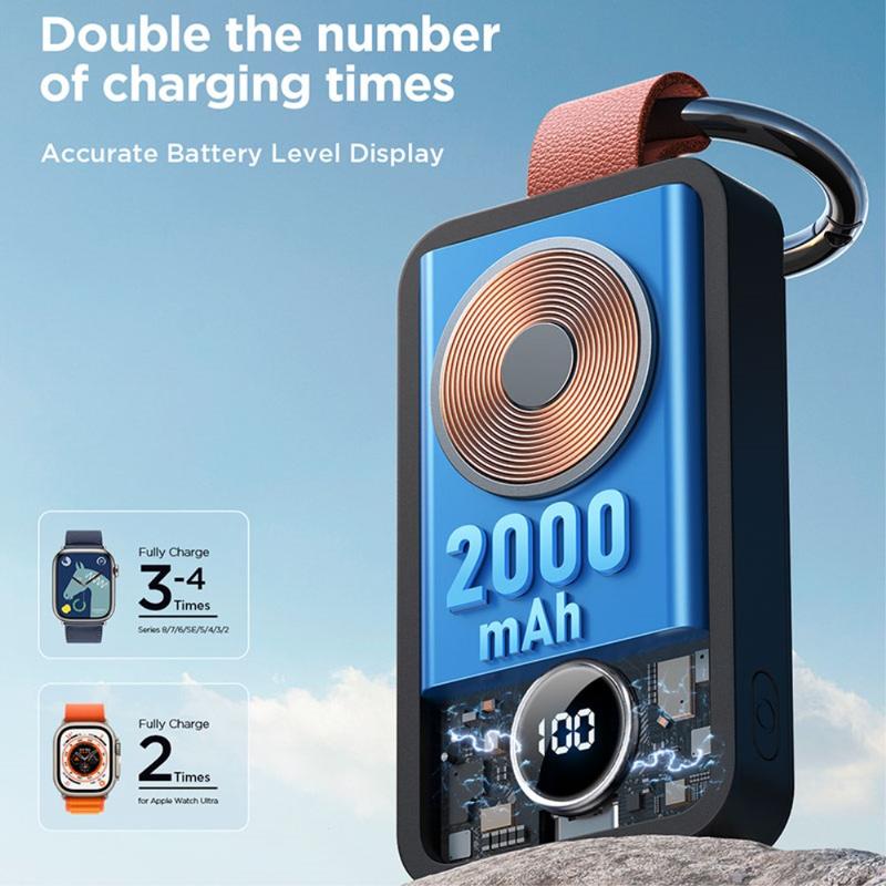 Keep your Apple Watch powered anywhere with the Joyroom JR-WQW01 portable wireless watch charger. This compact 2000mAh power bank is designed as a keychain-friendly charger with a clear digital battery display, so you always know how much power is left. With automatic sensing and plug and play use, it starts charging quickly without complicated setup, making it perfect for travel, workdays, and emergency top-ups.